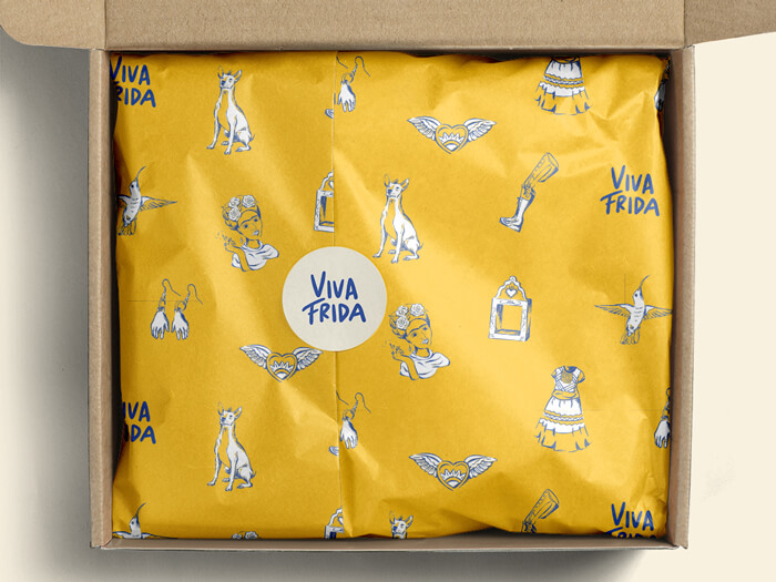 Utilizing illustrations designed to represent both cultural objects and items that were prominent in Frida’s life, we created products such as tissue paper, stickers, tape, and even tote bags that offer customers a chance to immerse themselves in the world of VIVA FRIDA as they unbox each package.